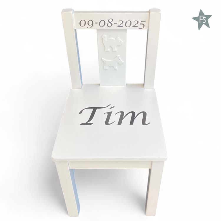 - De stoeltjes zijn wit en ze worden afgemonteerd en in cadeauverpakking geleverd.