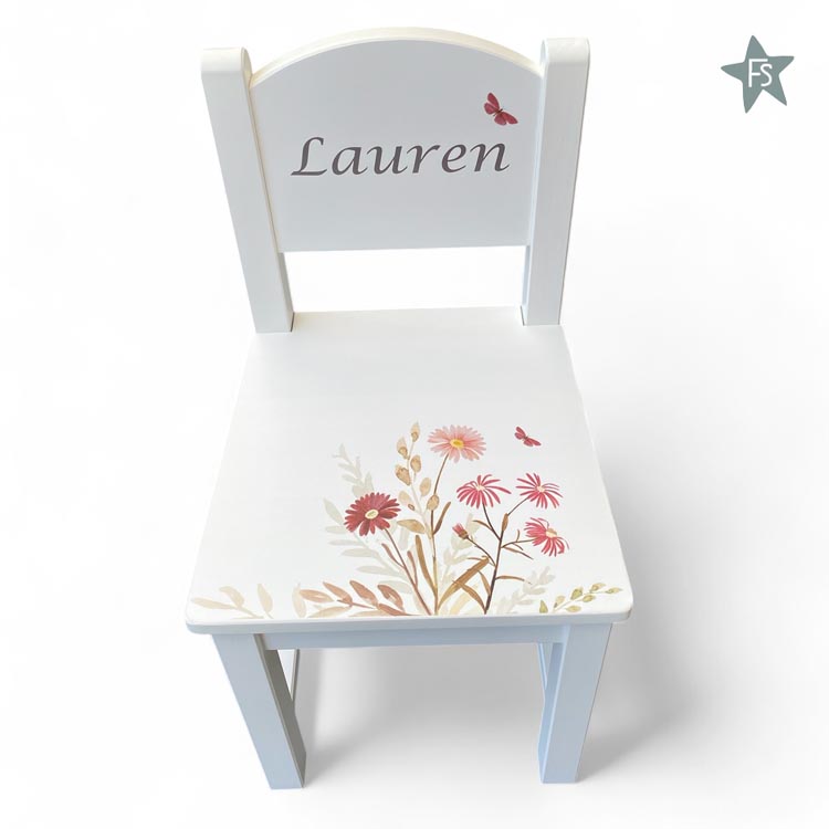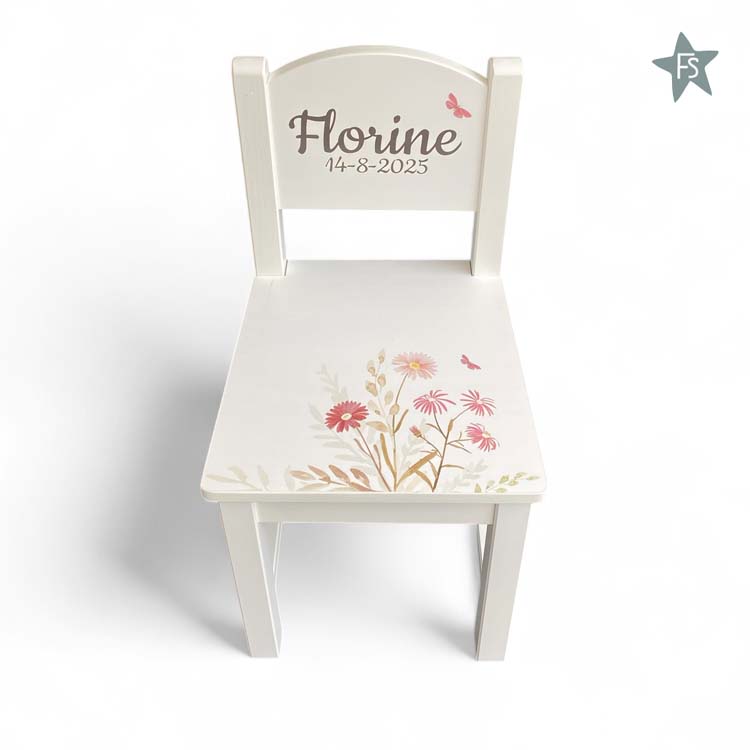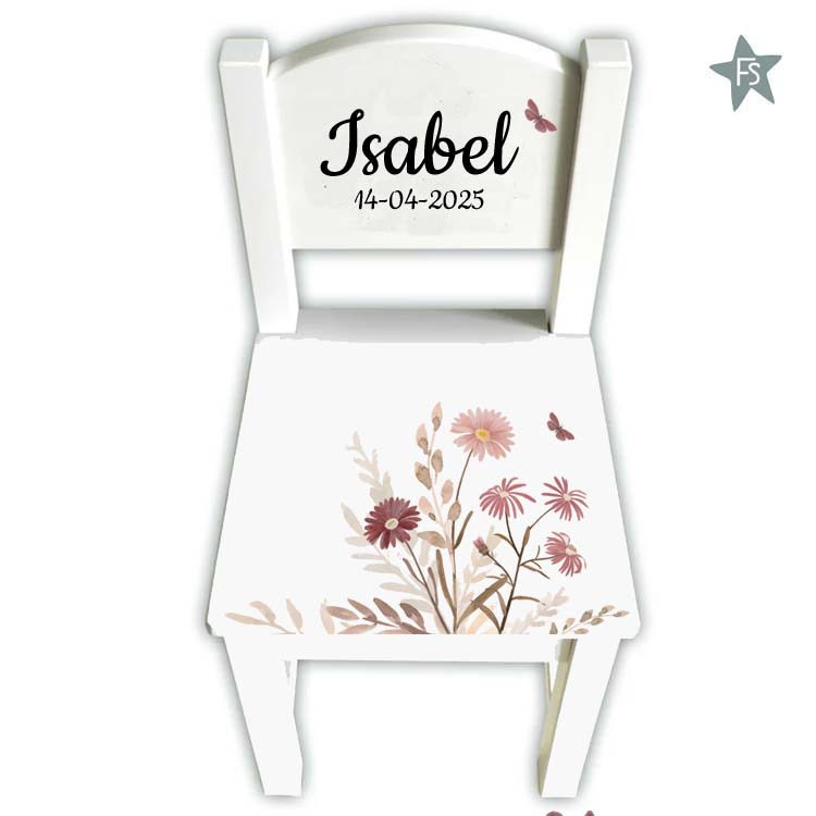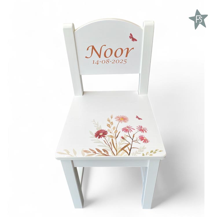 Stoeltje met naam, geboortedatum en leuke afbeelding.