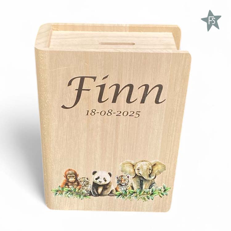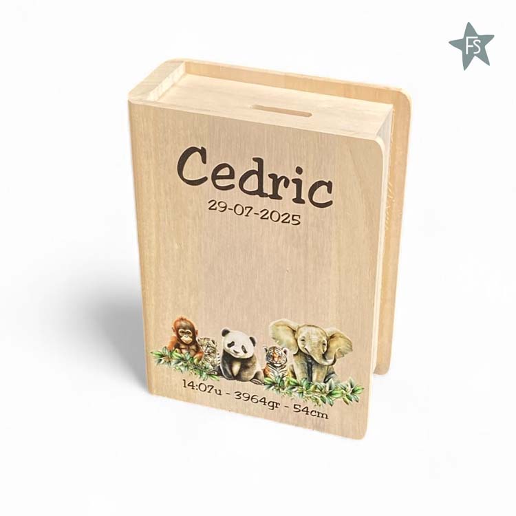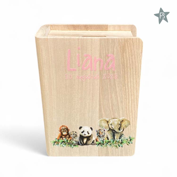 Bedrukt met de naam en geboortegegevens van je kleintje en jungledieren.