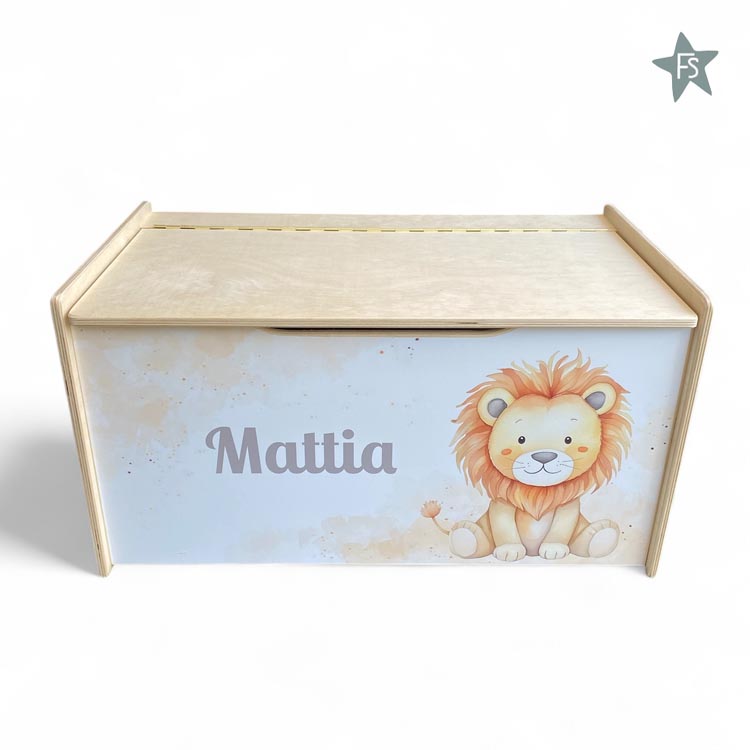 Mooie houten speelgoedkist met naam en leeuwtje, om al het speelgoed in op te bergen. De speelgoedkist met naam heeft aan de zijkant handige uitsparingen om de kist makkelijk te verplaatsen.