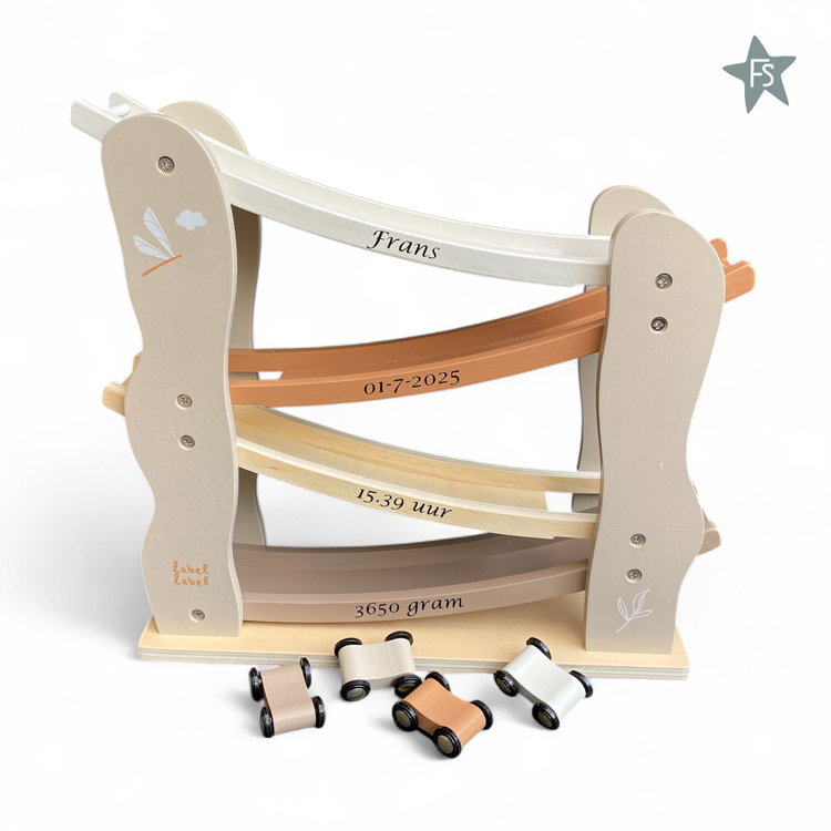 Je kleine zal urenlang speelplezier beleven met deze nougat houten autobaan van Label Label! Zet de autootjes één voor één bovenin de autobaan en laat ze naar beneden racen! Er worden 4 autootjes meegeleverd, zo kan je kleine goed in de gaten houden welke als eerst beneden is.