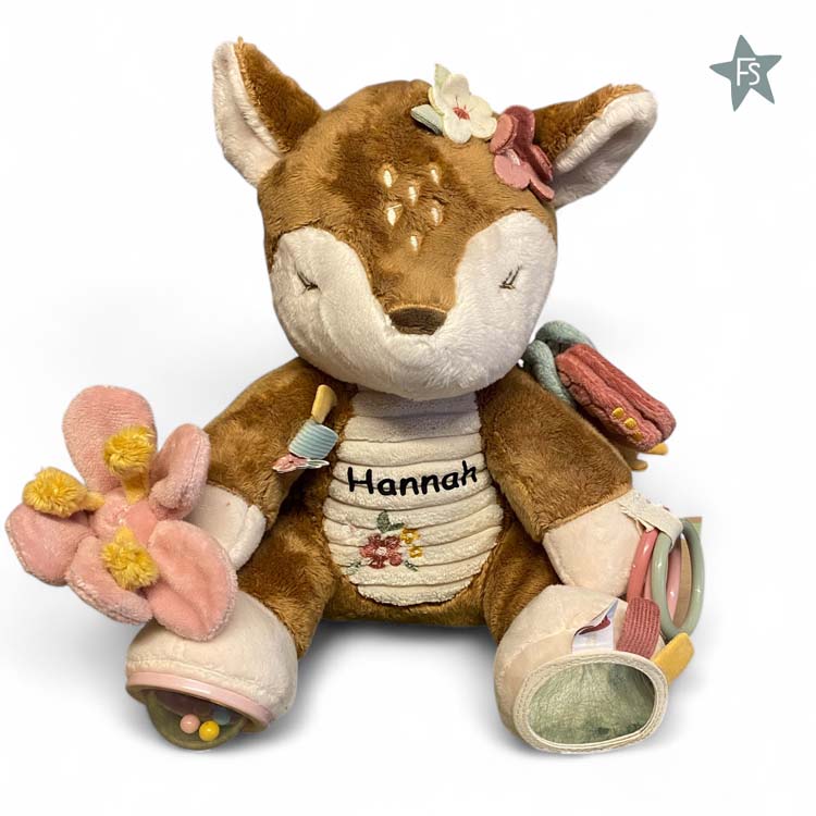 Knuffel en speel! Dit lieve hertje belooft meer dan alleen maar knuffels. Ontdek alle activiteiten die het verbergt. Het ratelende geluid, de knisperende vlinder op de schouder, en labels en bloemen om mee te friemelen. De ringen om het pootje en de spiegel onder één voetje - zoveel details om de nieuwsgierigheid van je kleintje te stimuleren. En na al dat spelen, inspireert het schattige hertje de zoetste dromen over de feeëntuin Fairy Garden.