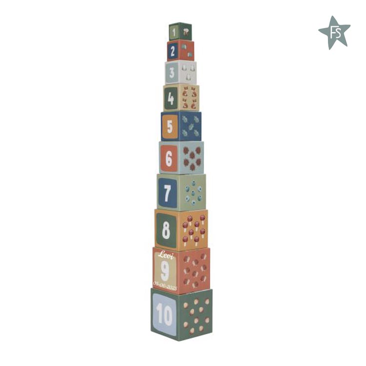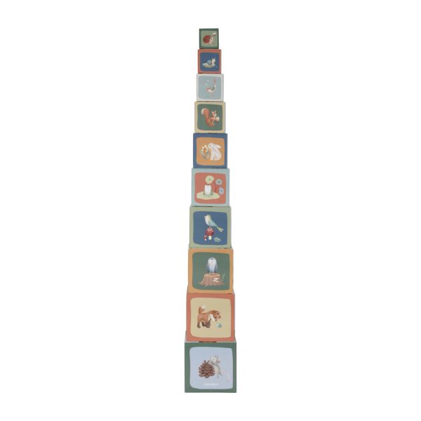 Stapel het ene blok op het andere en zie de magie van Forest Friends groeien! Je kunt de blokken op elkaar stapelen om een hoge toren te maken of ze horizontaal op de grond leggen. Ontdek vier betoverende taferelen terwijl je bouwt. Plaats het ene dier op het andere, van groot naar klein. Sorteer ze op twee manieren door te tellen, of verzamel alle afbeeldingen uit het betoverende bos. Kinderen leren spelenderwijs tot 10 te tellen met deze stapelblokken. De blokken zijn voorzien van prachtige illustraties uit de Forest Friends-collectie, waaronder eekhoorns, vossen, konijntjes, egels, uilen en paddenstoelen. Om ze gemakkelijk op te bergen, passen de kleine blokjes in de grotere. Gemaakt van stevig karton, kunnen de blokken tegen een stootje. Het kleinste blokje meet 5 cm en de grootste is 14 cm.