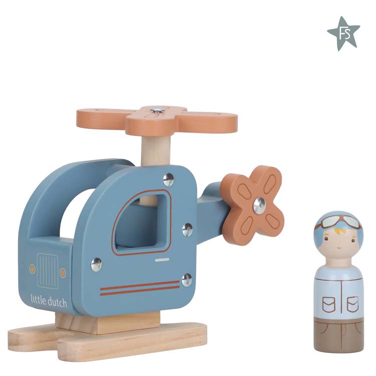 Vlieg samen op avontuur met deze houten helikopter in zachte blauwe tinten. De beweegbare propellers en houten piloot nodigen uit tot eindeloos fantasiespel. Gemaakt van stevig hout en perfect te combineren met andere voertuigen voor nog meer speelplezier.