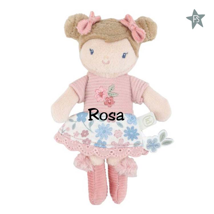 Maak kennis met Rosa, een lief knuffelpopje van 10 cm met schattige knotjes en strikjes in haar haar. Ze draagt een vrolijk bloemenrokje, een zacht T-shirt en laarsjes met een pompom. Perfect om cadeau te geven in haar handige doosje met koord. Gemaakt van heerlijk zacht stof voor eindeloos knuffelplezier.
